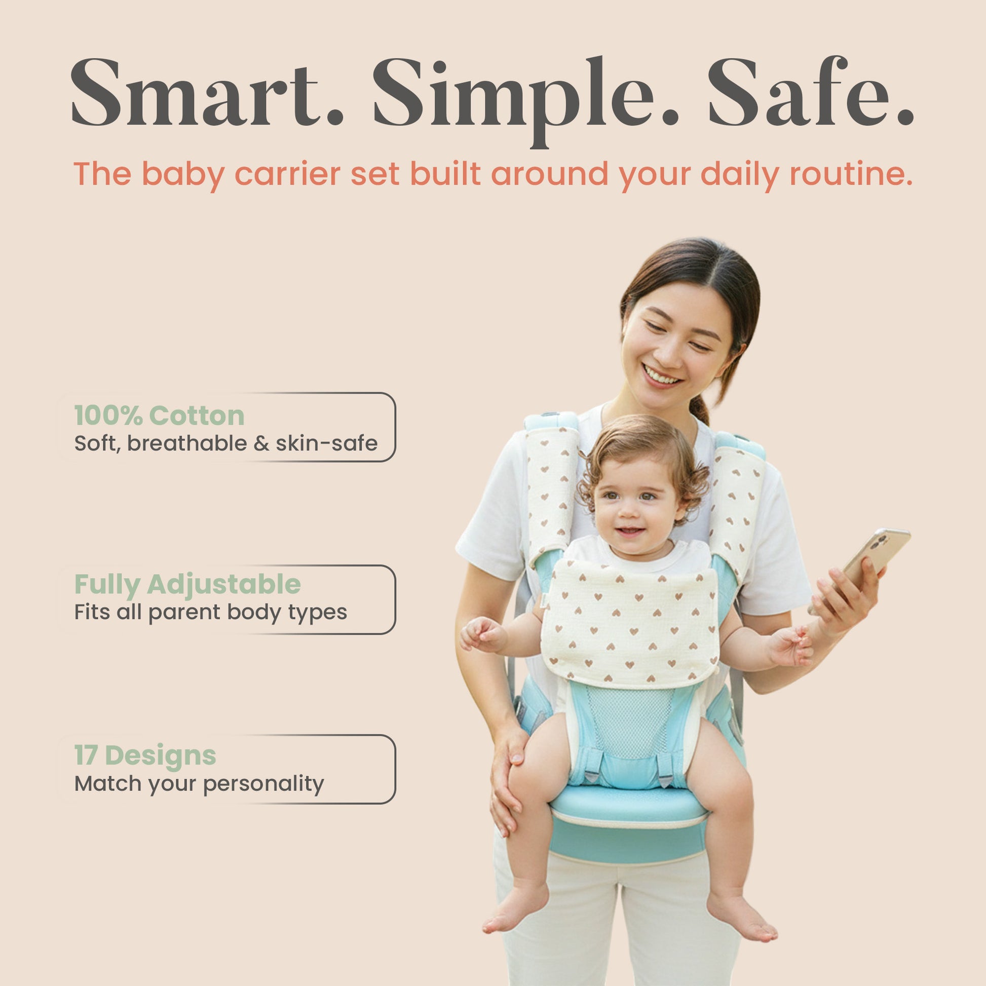 • Ergonomic design supports healthy hip development (M-position) and natural spine alignment for baby